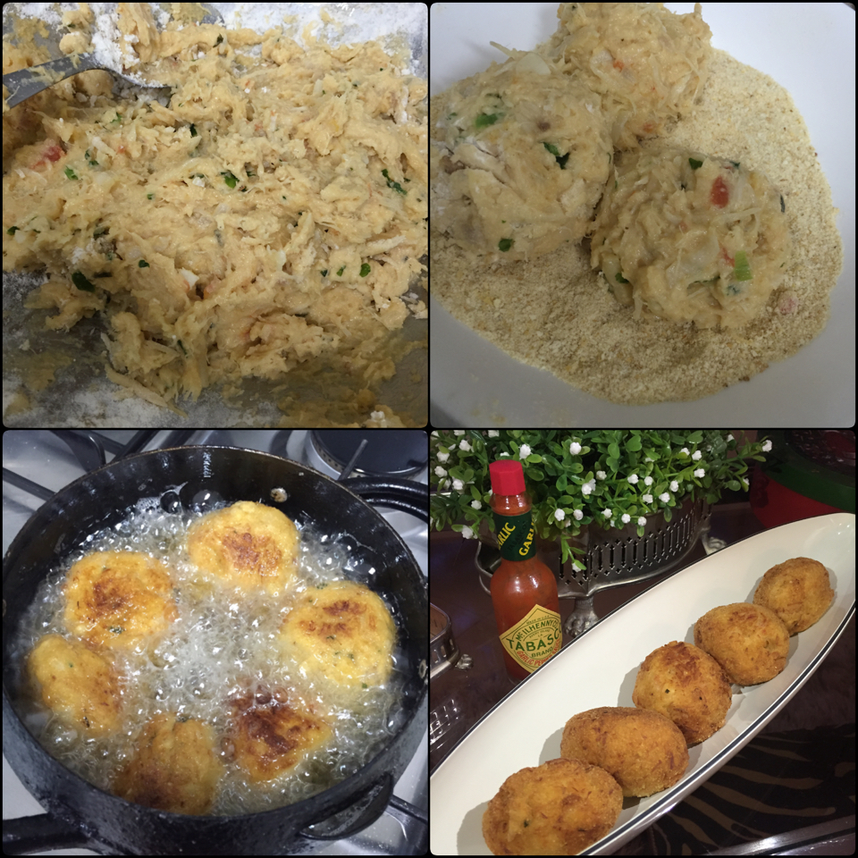 Para o caldo: Refogue a cebola, tomate com azeite e coloque o peixe e deixe refogar por alguns minutos, adicione água fervente, acerte o sal e deixe cozinhar o peixe por uns 10 minutos. Separe o peixe e desfie; Coe o caldo e cozinhe a batata em cubos neste caldo, depois de cozida tire do caldo e deixe esfriar e amasse- as, adicione um ovo, a garoupa desfiada e um pouco de farinha de trigo (até dar o ponto da massa). Faça bolinha, passe no ovo batido e na farinha de rosca ou panko e frite em óleo bem quente.