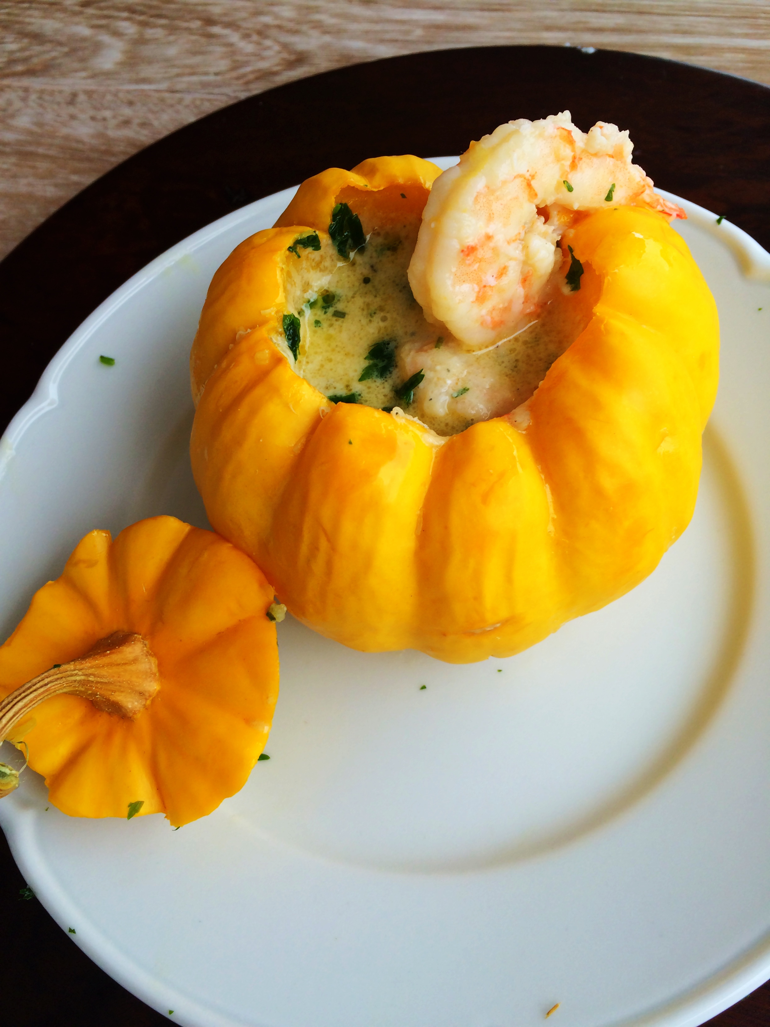 Desenforme ainda morno (quase frio é mais fácil) e sirva com o camarão pistola em volta (nós colocamos no meio).