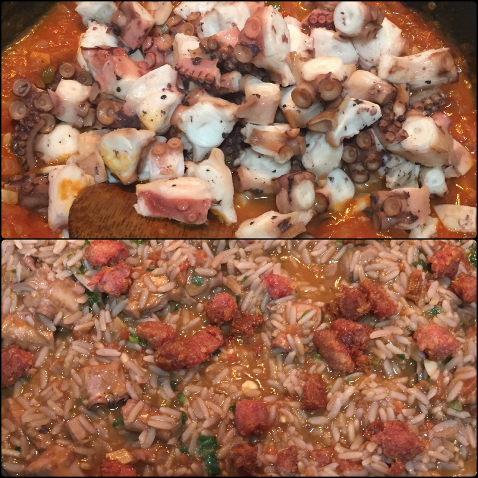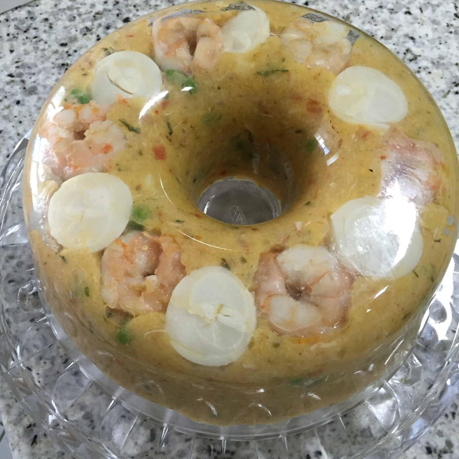 Unte uma forma de buraco no meio de 30cm com azeite e decore o fundo da forma com o camarão pistola cozido e rodelas de ovo (nós colocamos palmito). Coloque a massa ainda quente e vá apertando na forma até que fique rente.
